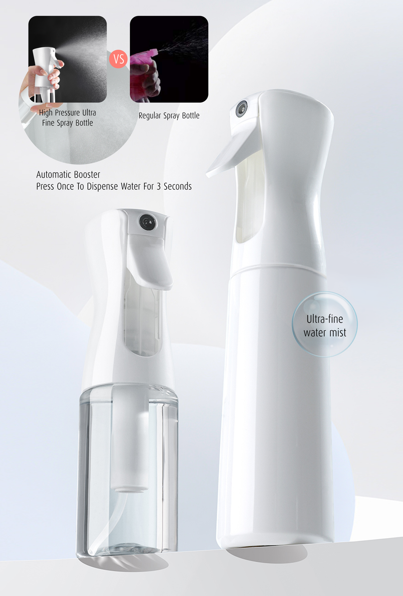 The ultra-fine mist spray pattern uniformly disperses water and gives just the proper quantity to lightly moisten the hair without making it seem gunked as with older styles, freshen curls, or tame a morning bed-head. High pressure ultra fine spray bottle features continuous spray that creates a persistent mist lasting for a few seconds, making it simple and quick to cover large surfaces. The ergonomic design is less tiring on the hands than conventional trigger and fingertip sprayers. Automatic booster — press once to dispense water for 3 seconds. Available in 200ml, 300ml, and 500ml sizes.